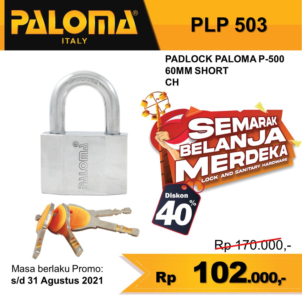 Padlock PALOMA.Locking Mechanism: Rotating Disc Cylinder.- Secured and Drill Resistant.Material Shackle: Hardened Carbon Steel.- Drill and Saw Resistant.Material Body: Hardened Steel.- Strong and Durable.Finishing Technology: Chrome Electroplating, Rust and Corrosion Resistant, Strong and Durable.Warranty: 5 Years Mechanical Warranty.Heavy Duty.4 Nickel Silver Keys Included.The Price Indicated is a Price per Piece.Gembok PALOMA.Mekanisme Penguncian: Silinder Disk Rotasi.- Aman dan Tahan Bor.Material Pengait: Hardened Carbon Steel.- Tahan Bor dan Potong.Material Body: Hardened Steel.- Kuat dan Tahan Lama.Finishing Technology: Chrome Electroplating, Tahan Karat dan Korosi, Kuat dan Tahan Lama.Warranty: 5 Tahun Garansi Mekanik.Heavy Duty.Sudah Termasuk 4 Anak Kunci Berbahan Nickel Silver.Harga Tertera Adalah Harga per