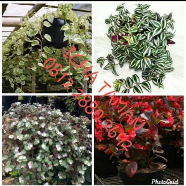 READY STOK....!!!Keterangan produk 1 paket berisi 4 jenis tanaman antara lain :1. Teplan2. Sabrina pink3. Kribo4. Begonia bunga merahPaket Tanaman hias pot gantung, bagus untuk hiasan teras rumah di gantung di kanopi dan lainya.Tanaman yang kami kirim sudah rimbun dan siap tanam dengan media polibek tidak berikut potnya untuk memudahkan packing.Stok ready silahkan langsung di o