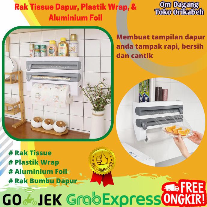 Kalau anda ingin simpel dan praktis dalam menaruh tissue roll, plastik wrap, atau aluminium foil, bahkan botol atau kaleng bumbu anda maka alat ini sangat direkomendasikan. Dilengkapi dengan 3 bagian untuk masing masing barang dan dilengkapi dengan cutter pemotong yang tajam. Selain itu bagian atas rak ini bisa untuk menaruh bumbu dapur, minyak, kecap, dllAlat ini bisa ditempel didinding/ kulkas/lemari dengan perekat sehingga tidak merusak dinding. Atau bisa juga dengan sekrup. Fungsi Alat ini :- Menaruh tissue roll, plastik wrap dan aluminum foil dalam satu rak, sehingga dapur lebih rapi dan nyaman- Bagian atas rak bisa ditaruh bumbu dapur, botol minyak, kecap, dll- Dilengkapi pemotong/ cutter untuk plastik wrap dan aluminum foil, sehingga praktis dipakaiSpesifikasi :Bahan : Plastik PP Eco FriendlyDimensi : 38*10*24 cmAccecories : 2 Buah Cutter/pemotongInclude : Sekrup & Tape PerekatWarna : Abu abuKelebihan alat ini :- Bahan plastik PP yang kuat membuat kokoh rak penyimpanan ini. - Cutter yang tajam membuat hasil pemotongan plastik dan aluminium foil rapi dan mudah- Fungsi 4 in 1 membuat dapur anda menjadi rapi dan enak dipandang(rak tempat bumbu, tissue dapur, plastik wrap dan aluminium