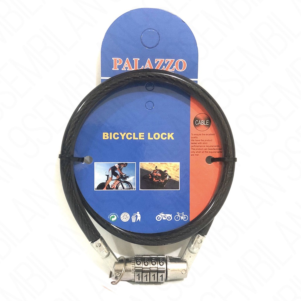 Kunci Sepeda Nomor Palazzo / Gembok Sepeda Nomer Sling / Gembok Motor :- Kunci sepeda Palazzo menggunakan sling 8mm yang sangat kuat untuk melindungi sepeda Anda dari resiko pencurian- Desain kunci-nya yang sudah menggunakan fitur Nomor, dengan Kombinasi 4 Digit angka, yang membuat kunci sepeda palazzo sangat aman menurut minniestore, karena hanya Anda yang tahu kombinasi nomor untuk membukanya.- Panjang Sling kunci sepeda 65 cm- Sling telah dibalut dengan karet pelindung sehingga tidak mudah karat- Praktis dan mudah digunakan, cocok untuk segala macam sepeda dan sepeda motor- Perlindungan Terbaik untuk Sepeda atau motor kesayangan Anda- Original 100% Palazzo, Tools n Hardware. (Awas Barang Tiru