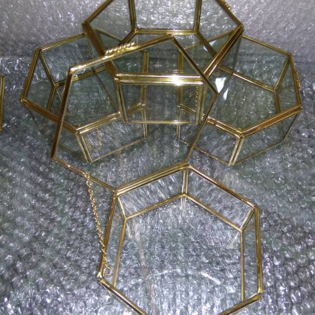 material kuningan & kacasize L 12cm T 5cmBox hampers hexa segi6 datar / box terarium tempat cincin / box mahar. Size L 12cm T 5cm tutup buka ke atas.Produk yang di foto asli langsung dari tangan pertama. Kami menerima order dlm jumlah banyak, untuk tanya² bisa langsung chat