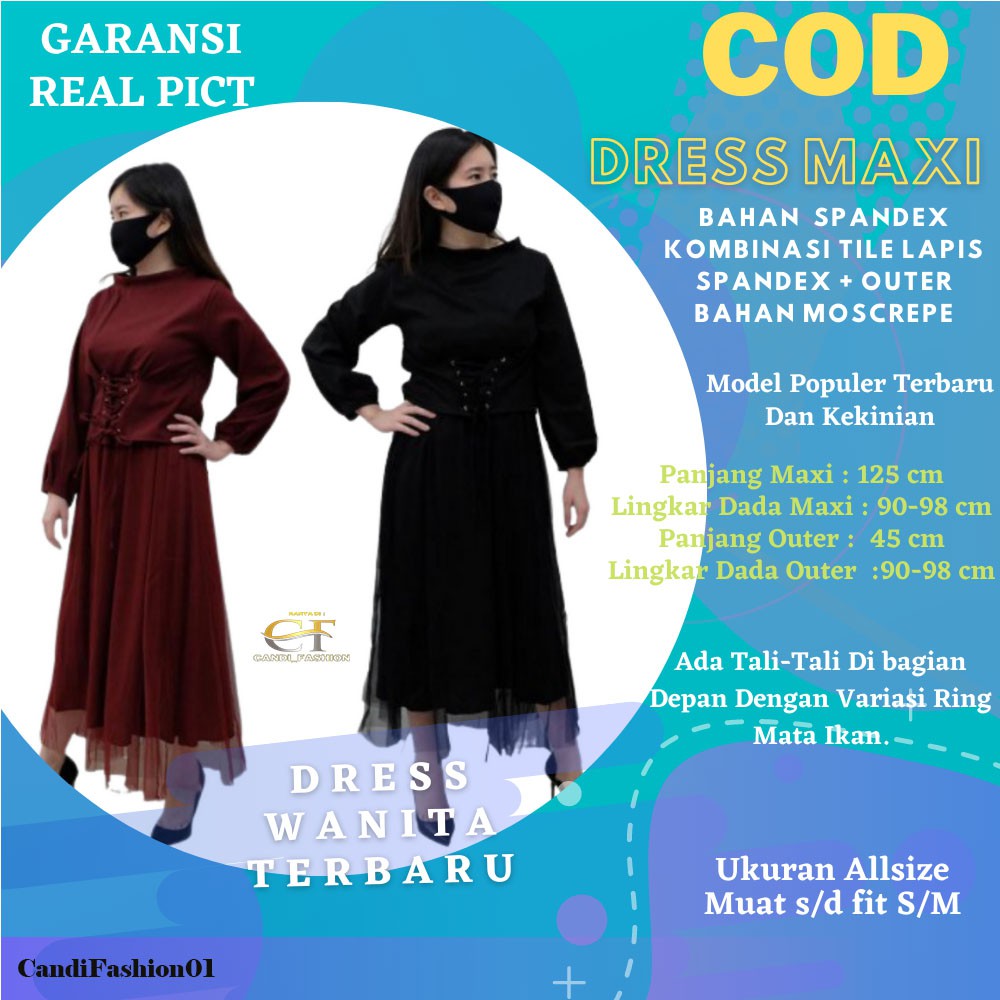 Real PIC!!! Tinggi model 152, berat badan 46.Dress maxi bahan spandek kombinasi tile lapis spandek + outer bahan mosscrepe.Model populer terbaru dan kekinian dengan banyak repat order.Panjang Maxi: 125Lingkar Dada Maxi: 90-98Panjang Outer: 45Lingkar Dada Outer: 90-98Ada tali-tali di bagian depan dengan variasi ring mata ikan.Ukuran allsize, muat s/d fit S/M.Produk aktif di etalase = ready.Namun sangat disarankan untuk menanyakan stok terlebih da