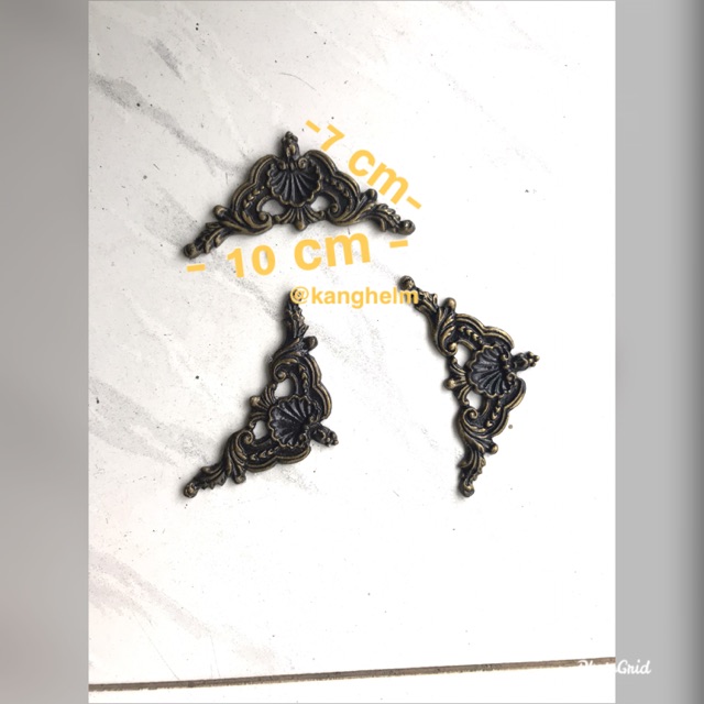 Hiasan sudut tebal dan besar sebagai pelengkap hiasan kotak seserahan/hantaran untuk kesan klasik yg mewah atau untuk keperluan lainnya. Harga yg tertera merupakan harga untuk 1 pcs.Warna : Coklat keemasanUkuran : 10 cmBarang yg sudah dibeli tidak dapat ditukar atau dikembali