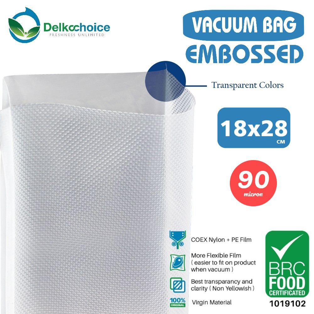 PLASTIK VACUUM / VACUM BAG EMBOSSED / PLASTIK VAKUM MAKANAN EMBOS - DELKOCHOICESPESIFIKASI PRODUK :PLASTIK VACUUM EMBOSSED (BERTEXTUR)KETEBALAN : 90 mikronUKURAN : 18cm X 28cmKETERANGAN :Plastik Vacuum Sealer Embossed Delkochoice, Plastik Vakum Premium dibuat dengan material pilihan, sangat kuat dan elastis. Dengan kategori food grade dan memiliki sertifikasi tertinggi dalam standard internasional untuk plastik makanan. Harga ekonomis membuat plastik ini menjadi pilihan terbaik bagi Anda.Delkochoice, It's your cho