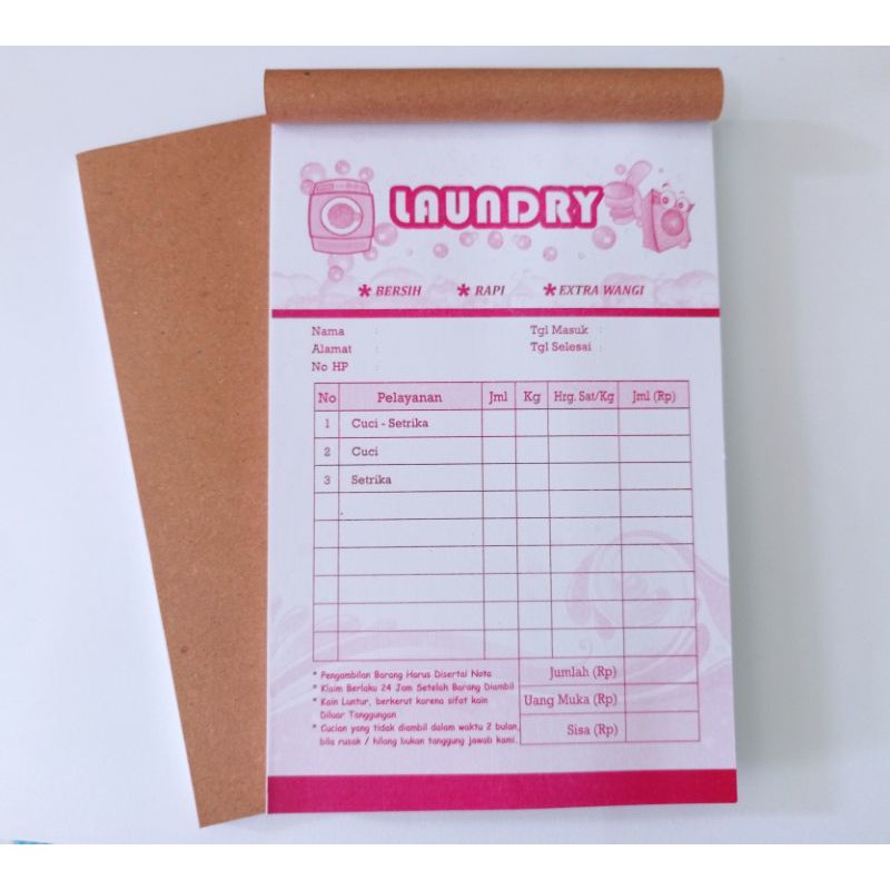 Ready nota laundry tinggal pakai,tidak bisa dicustomdan tanpa rangkapBahan : kertas HVS (tanpa rangkap) Isi : 50 lbFinising : Blok lemUkuran : 10 x 16 cmJika berminat tinggal klik aja ya kakTerima kasih dan selamat berbelanj